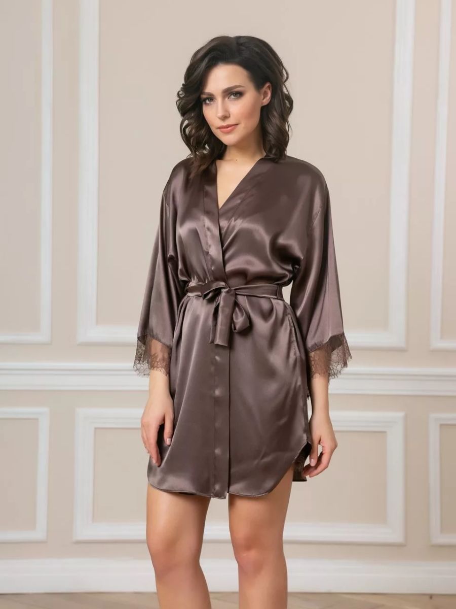 Короткий халат на запах из искусственного шелка с поясом, декорированный кружевом по рукаву.