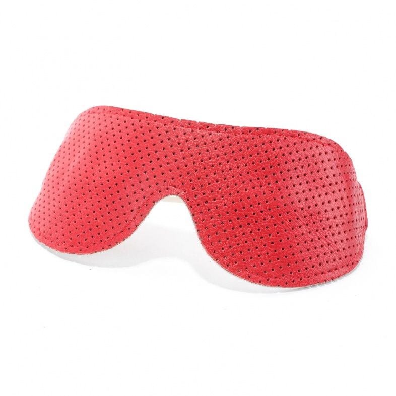 Маска из натуральной кожи на резиночке. Декорирована ярко-красными крестиками. Имеет красный подклад из мягкой перфорированной кожи. Ширина - 7 см.