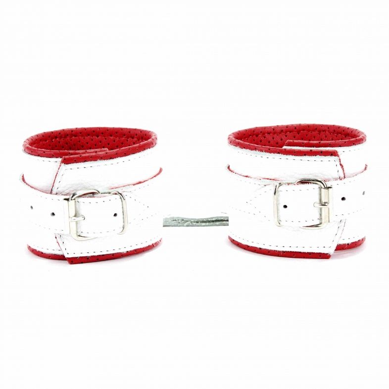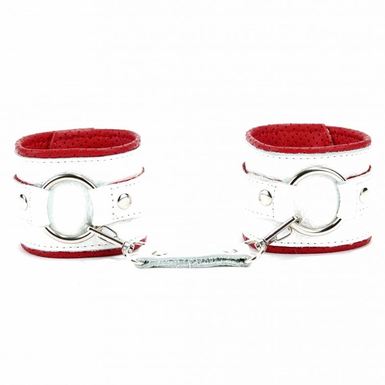 Наручники из белой кожи с кольцом с мягким подкладом из перфорированной кожи. Сварная металлическая фурнитура для надежной фиксации. Ширина - 6 см.
