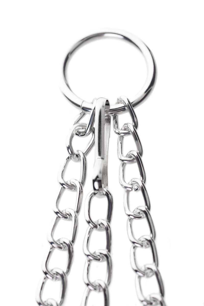 Мужская версия зажимов для воздействия на соски. Сила сжатия регулируется болтиками и может быть усилена или ослаблена во время интимной игры. Дополнительное ограничение свободы обеспечивает металлическое кольцо на пенис. Длина сцепки - 50 см. Длина зажимов - 5 см. Диаметр кольца - 4 см.