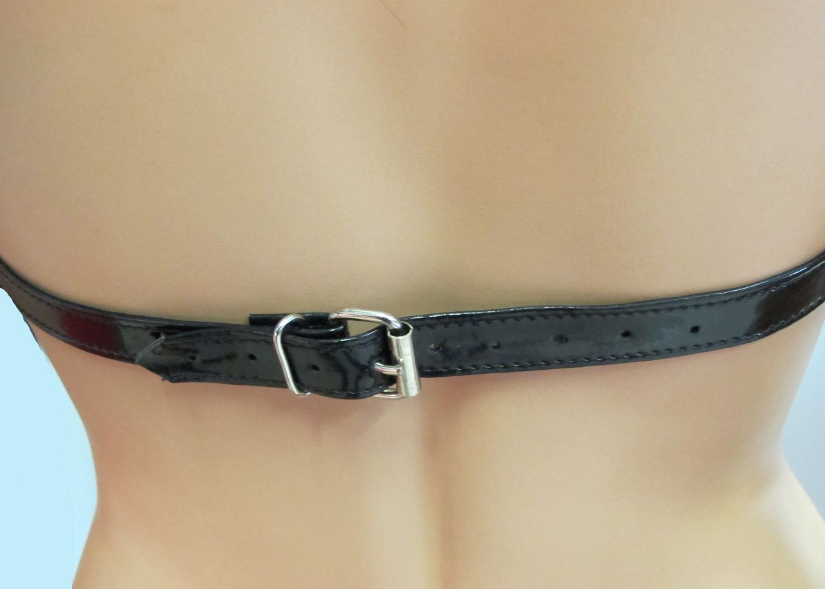 Женская сбруя на грудь. Изготовлена из блестящего лакового материала с мягкой подкладкой в области шеи. Детали несъемные, размер регулируется при помощи кнопок (на шее) и застежек (на спине).